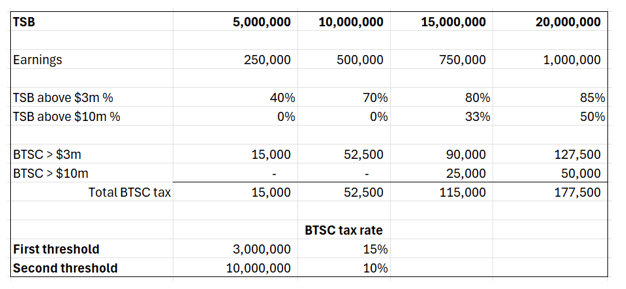 The new $10m threshold will be subject to an additional 25% tax on the proportion of earnings relating to TSB over $10 million (ie, 15% above the $3m threshold plus a further 10% over the $10m threshold). That is, an overall tax rate of 40% on the proportion of earnings corresponding to TSBs above the $10m threshold. Refer to the table below for further details on this point.