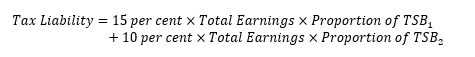 Note: The tax liability formula gives effect to the two-tiered approach, applying an additional 15% tax on the proportion of earnings corresponding to the TSB between $3m-$10m, and an additional 25% tax on the proportion of earnings corresponding to the TSB above $10m. These apply in addition to the fund’s concessional tax rate of 15%.
